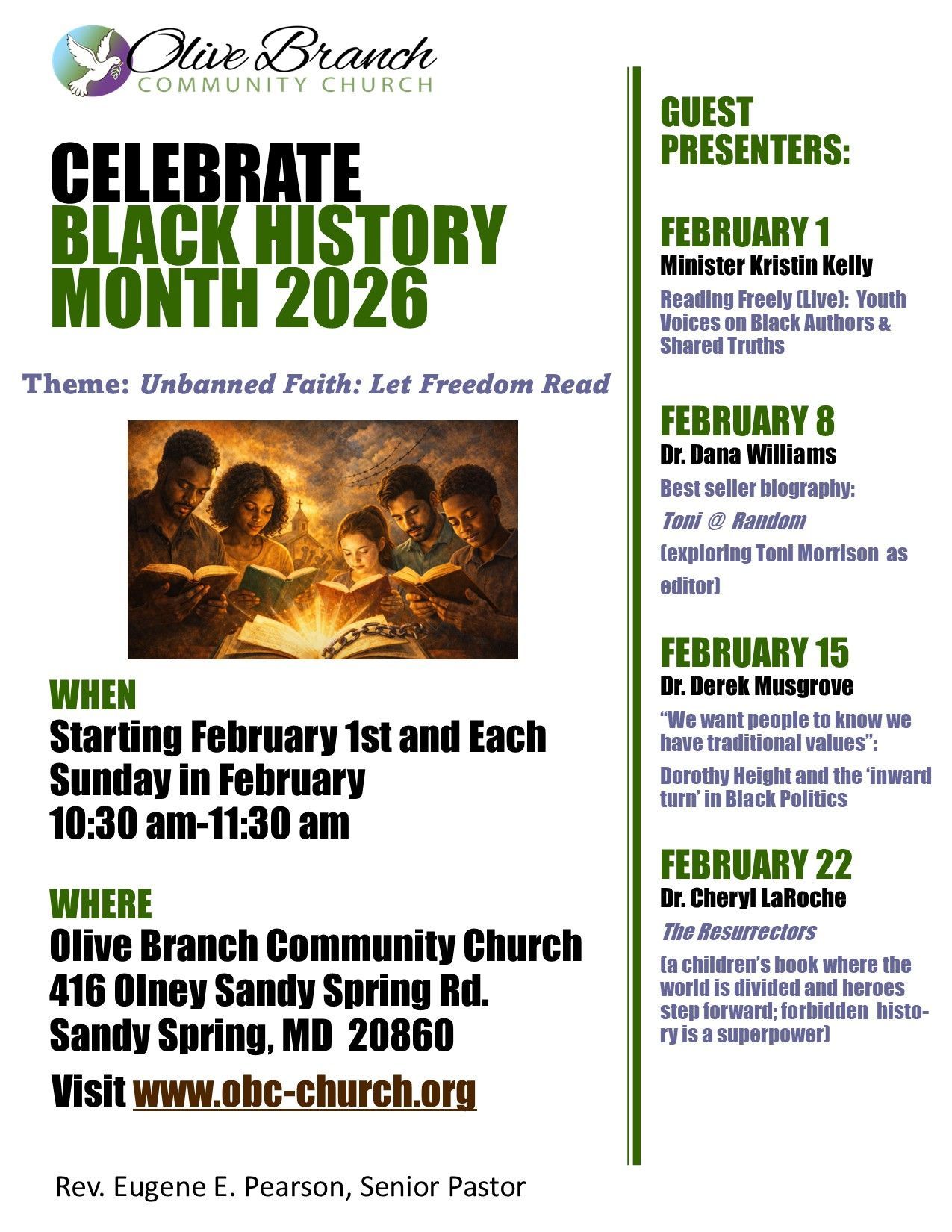 We at The Olive Branch Community Church acknowledge African American history 365 days a year. In 2026, we join the nation-wide, century-old celebration of Black History Month --the time set aside to honor our past and point towards our future. Our 2026 theme for Black History Month is "Unbanned Faith: Let Freedom Read." This theme encourages us to appreciate the connection between the historical struggle for literacy and spiritual and intellectual freedom. The theme provides a natural bridge between faith, education, and social justice, leveraging the power of literature/storytelling and the biblical theme of liberation. It declares our embrace of hope, our determination to read, our commitment to tell others, and the power to flourish in this world.